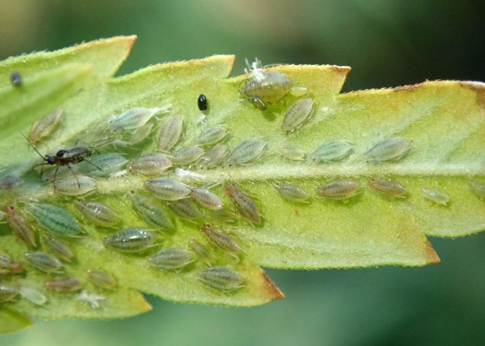 Крошечные белые жучки овальной формы, с крыльями или без, одни из самых назойливых насекомых, питающих особую симпатию к растению каннабиса. Тля занимает особое место в антирейтинге вредителей, которых больше всего опасаются даже опытные агрономы. Внешне они выглядят довольно безобидно, но эта мелюзга способна проворно размножаться и заполонить своим присутствием все растение. Афиды перемещаются колониями по несколько десятков и даже сотен особей и предпочитают селиться как на нижней стороне листьев, так и на любой части растения, вгрызаясь зубами в лист, стебель или соцветия и питаясь их соками. Прикрепившись, тля становится неподвижной, и ее довольно легко обнаружить. Эти насекомые способны наносить как первичный, так и вторичный урон. В процессе жизнедеятельности тля выделяет большое количество сахаристой жидкости, так называемой «медовой росы». Ее капли приводят к образованию плесневых налетов, которые, разрастаясь на листьях и ветвях, впоследствии окрашиваются в черный цвет. Появление муравьев у основания или на самом растении – верный признак заражения тлей. Муравьи питаются «медовой росой» и в данном случае выступают в роли своеобразных телохранителей, защищая свой "источник питания" от других хищников.