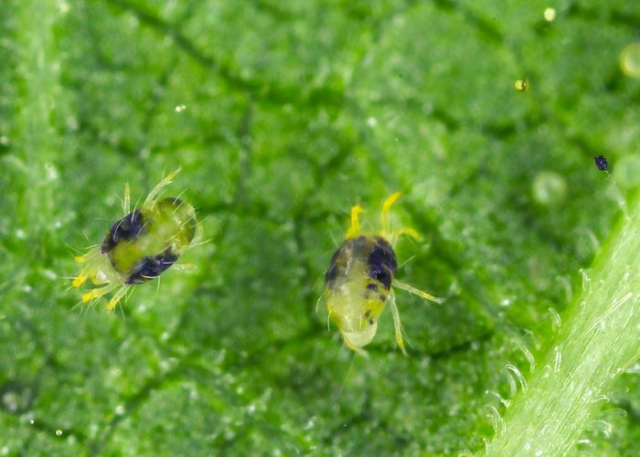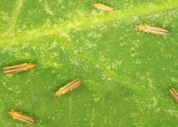 Жуки, похожие на червяков, которые передвигаются с помощью ножек и могут иметь крылья в зависимости от их зрелости. Они могут быть темного, желтого, золотистого или матового оттенка. Сложно заметить одиночную особь трипса, поскольку они, как правило, перемещаются отдельными популяциями. В процессе жизнедеятельности трипсы оставляют после себя блестящие серебристого или бронзового оттенка пятна в местах укусов на листьях растения. Место поражения может выглядеть как высохшая слюна. Трипсы высасывают хлорофилл из листьев, в результате чего они становятся темными и хрупкими, впоследствии осыпаясь. Женская особь трипса прогрызает отверстие в растительной массе, куда откладывает яйца будущего потомства. Их любимым лакомством является соцветие. Поражение растения трипсами может привести к замедлению его развития, «вписка» в шишки станет причиной снижения урожайности, а захват всего растения – к полной гибели растения. Трипсам не нравится постоянное беспокойство в виде интенсивного встряхивания ветвей растения. Но будьте осторожны, поскольку, таким образом, вы мимовольно можете стать причиной их распространения на соседние растения и данный подход не будет иметь смысла.