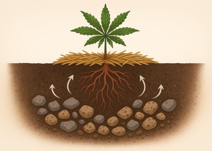 Мульча — это не просто способ прикрыть землю от солнца. Это активный элемент живой агротехники, который одновременно защищает, стабилизирует и питает почвенную экосистему. Органический мульчирующий слой толщиной 5–10 см играет сразу несколько ролей: удерживает влагу, снижает колебания температуры, препятствует росту сорняков и, самое главное, становится источником пищи для микроорганизмов. Все это — прямой вклад в здоровье корней и стабильный рост каннабиса.