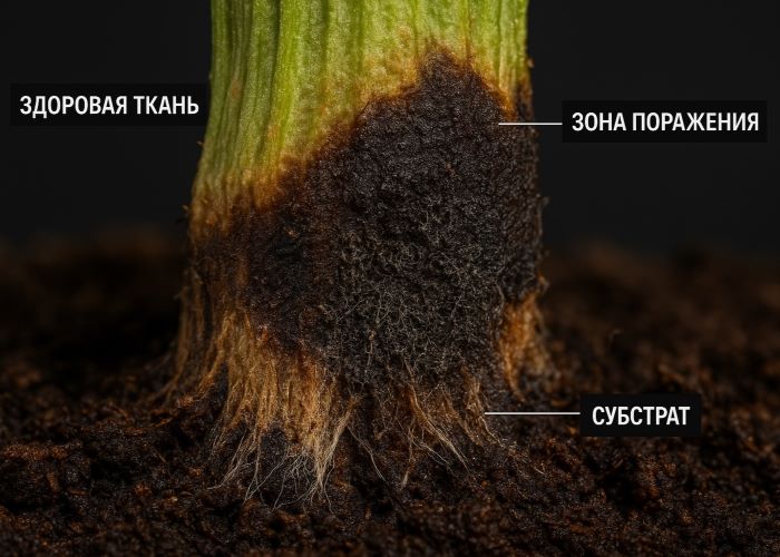 Почти всегда очаг появляется у основания стебля, прямо у поверхности почвы. Если вы видите проблему где-то на верхушке — скорее всего, это что-то другое. Стеблевая гниль любит стартовать у корней и подниматься вверх. - Что с тканями?