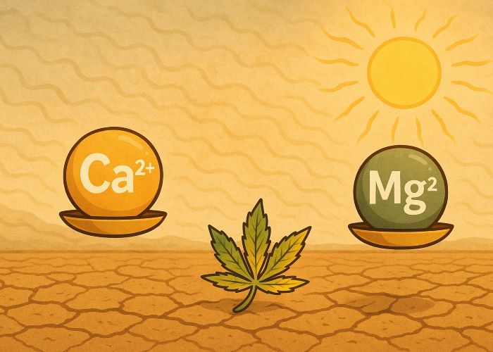 Летом, на фоне жары и ускоренного обмена веществ, питание каннабиса становится гораздо более чувствительным к ионным конфликтам. Магний и кальций — оба катионы с положительным зарядом (Mg²⁺ и Ca²⁺), и именно в условиях стресса они начинают конкурировать не только между собой, но и с другими ионами в растворе. Это тонкая, но крайне важная часть минеральной логистики, которую жаркая погода резко обостряет.